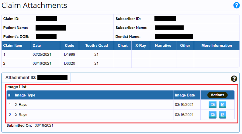Double check the images were attached by logging into DentalXChange > claim search > find the claim > view claim > scroll down to the bottom > manage attachments