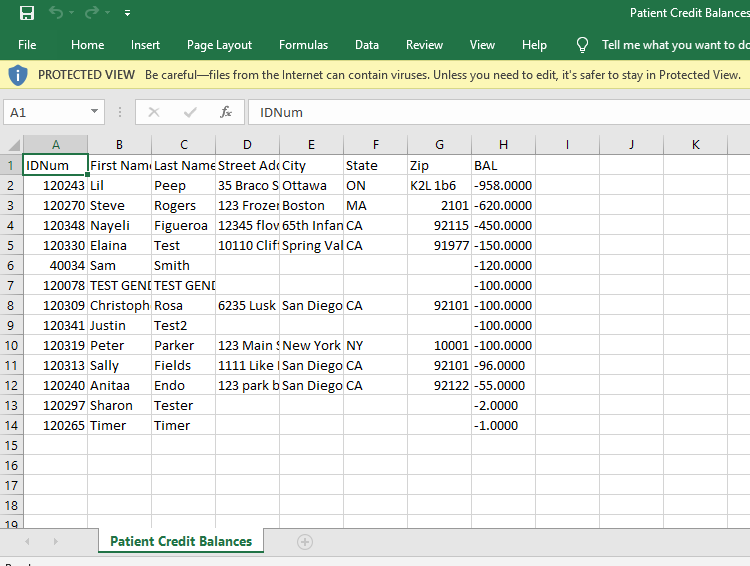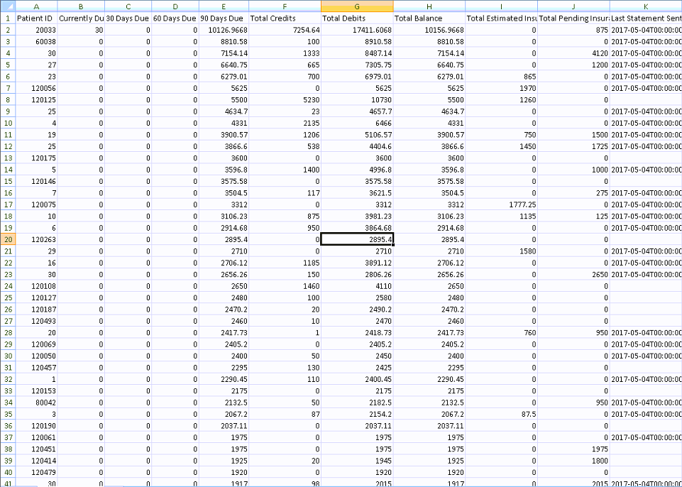 This is similar to the Aging Analysis function found in TDO: [Reporting Tools > Financial > Aging Analysis]. No parameters need to be specified when generating this report, the spreadsheet generated will have a row for every patient who has a balance. There will be separate columns for: [Balance] Currently Due, 30 Days Due, 60 Days Due, and 90 Days Due, etc.