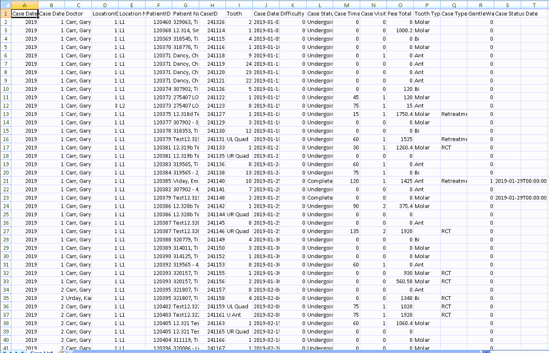 There are columns indicating Case Status, Number of Visits, Fee Total, Tooth Type, Case Type, and whether or not the GentleWave Procedure was marked in the Treatment page for that case.