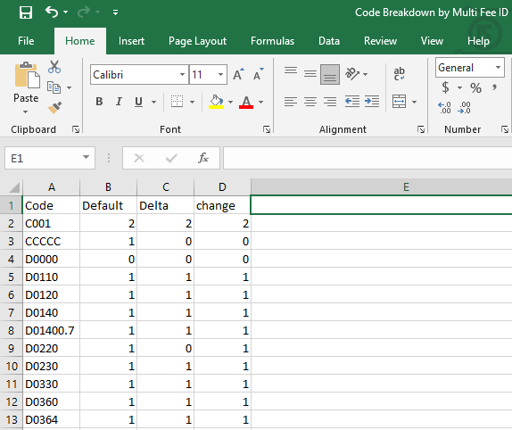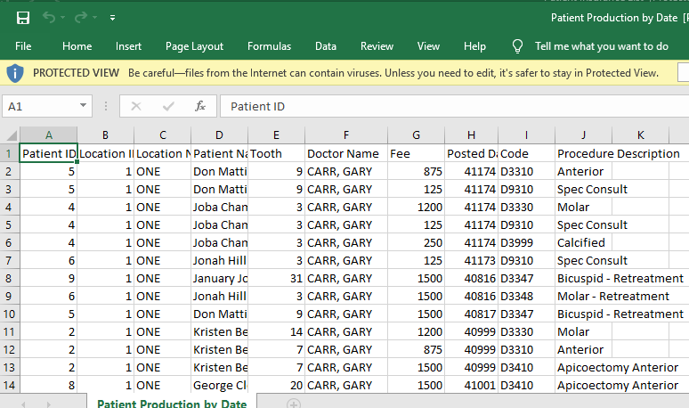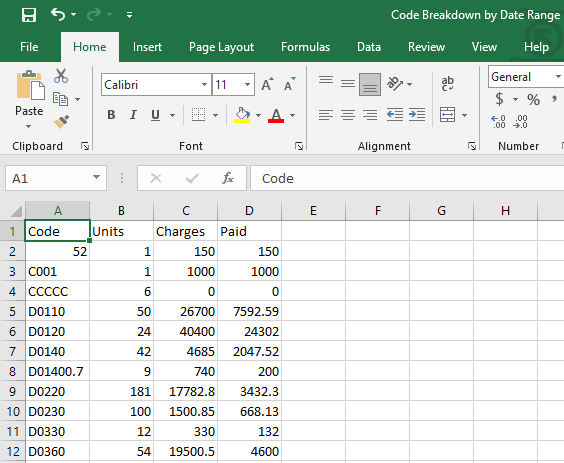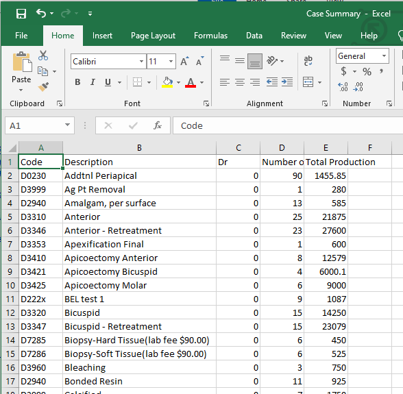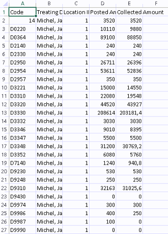 This report consist of two sheets, Codes by Doctor and Code Totals. Codes by Doctor breaks has a row for each column, separated by Treating Doctor and Location. Code Totals combines each doctor’s production and collection for each code into a single row (one row per code). Each sheet has columns for the Posted Amount and Collected Amount for each code.