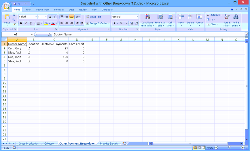 - Other Payment Breakdown tab: will show the payments collected from other types of payments such as Electronic Payments or any other custom type of payments; by Doctor by location.