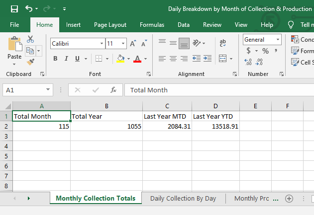 Report will show Monthly Collection totals, Daily Collection by Day, Monthly Production, Daily Production by Day
