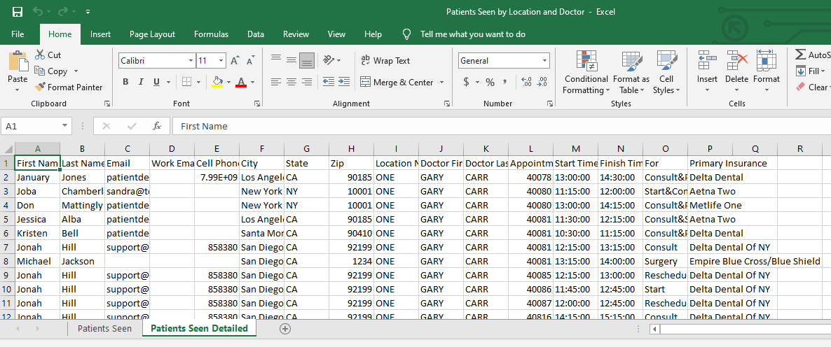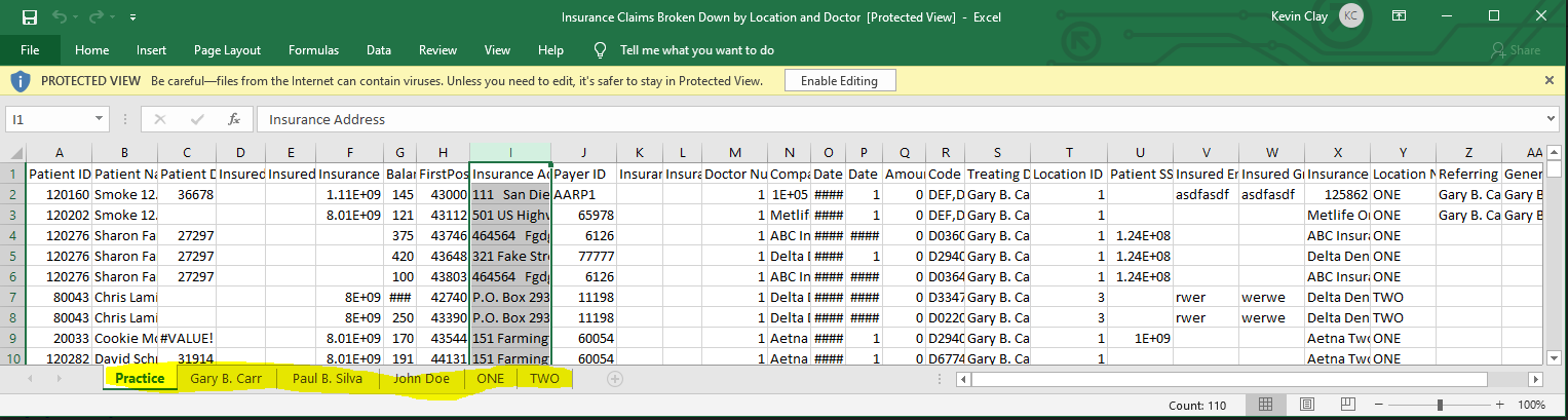 This report is broken down by the two tabs at the bottom - one looking from a location perspective and the other from the doctor perspective.