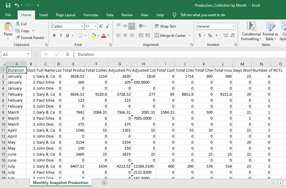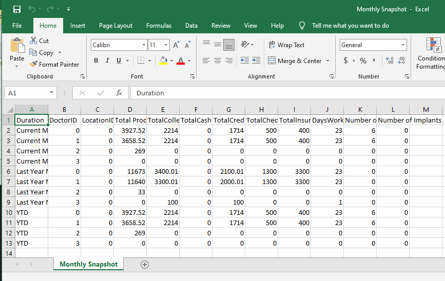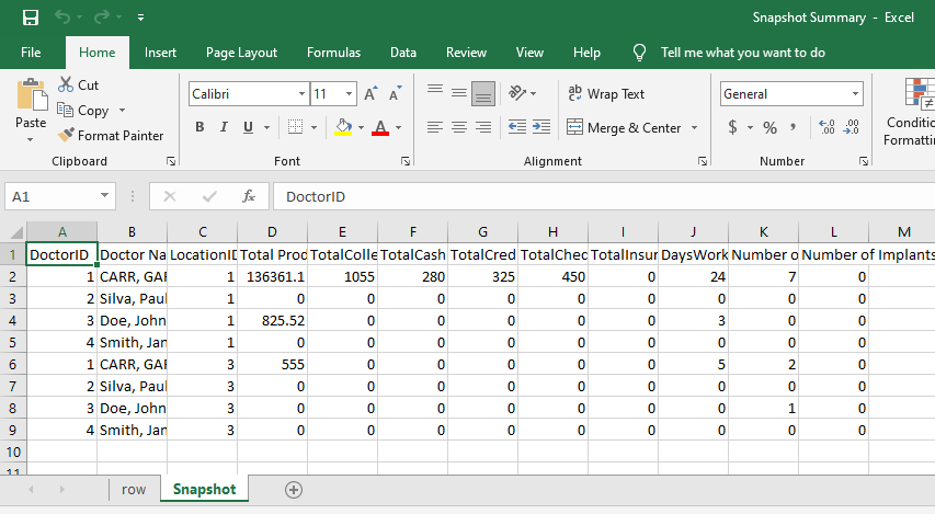 This report will show Production, Total Collection, Total Cash, Total Credit Card, Total Checks, Total Insurance, Days Worked, Number of RCTs, and Number of Implants