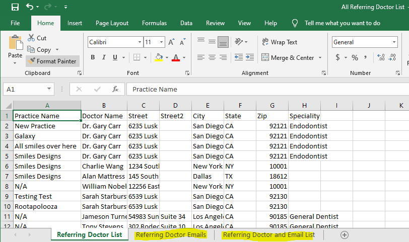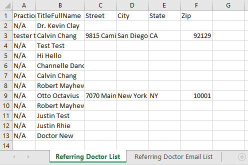 This report will allow users to have a list of all referring doctors added in the system on a given date range. This reports will be useful for mail merges. This report has two lists: Referring Doctor List in one of the tabs and the Referring Doctor Email List.