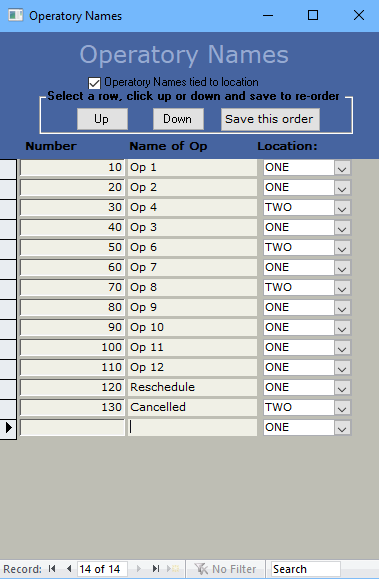 Alternatively, you can edit the values in the ’Number’ field to reorder the operatory list. The lowest Number will be the leftmost tab on the calendar and the highest Number will be the rightmost tab.
