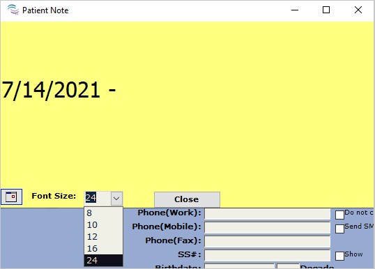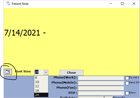 This feature will allow the staff and providers to increase the font size on the ’Patient Notes’. Note: this setting is per workstation. In the Patient Note form users will also find a Calendar button to add the date the note is being added in one click.
