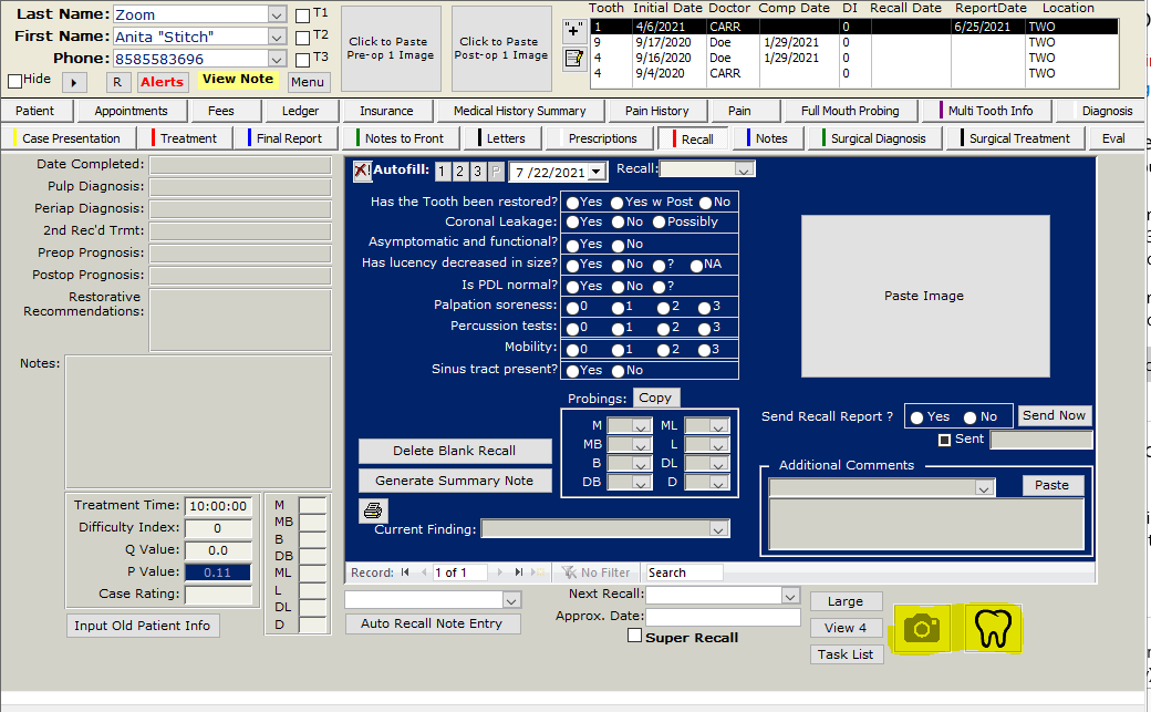 After ensuring that you have the correct case selected, open the Recall page. From this page, you can click either the Camera or Tooth icon to take a Recall image (either a Picture or a Radiograph) of the tooth.