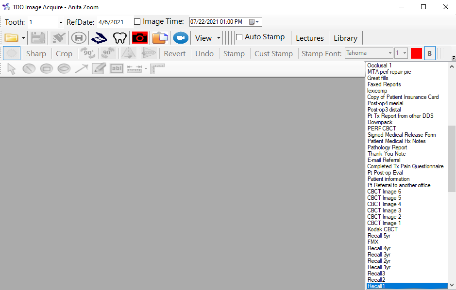 Clicking the tooth button will automatically open the Acquire window, select the Recall1 category, and, if you have configured Digital Radiography in the Control Table (v11: [Administrative > Edit Control Table > Workstation Settings > Digital Radiography], v12: [Setup > Site Configuration > Edit Control Table > Workstation Settings > Digital Radiography]), initiate taking a radiograph.