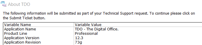 First, install TDO on the new server. Make sure that you install the same version of TDO on the new server as you are running on the old server. To check what version of TDO you are running open Help > About TDO/Submit Ticket.