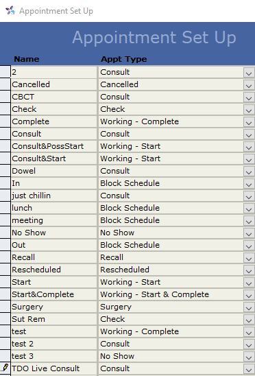 Program Setup > Appointment Setup and add “TDO Live Consult” as a Consult type appointment. This is not case sensitive, but it needs to be spelled exactly as shown below to work correctly.