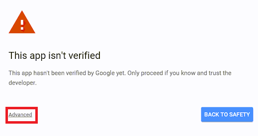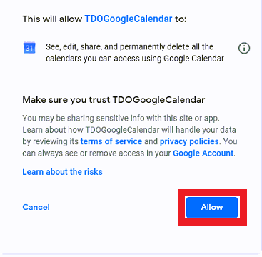 If prompted, click ’Advanced’ and then ’Go To TDOGoogleCalendar (unsafe)’ (Don’t worry, this application is safe, just hasn’t been verified by Google yet).