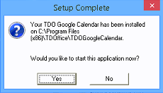 After the installation is complete, you will be prompted to launch the TDO Google Calendar Sync. Click ’Yes’ to launch the sync tool.