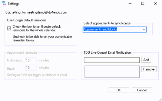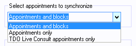 - Appointments only: will synchronize all types of appointments, including “TDO Live Consult”. It will NOT sync Block appointment.