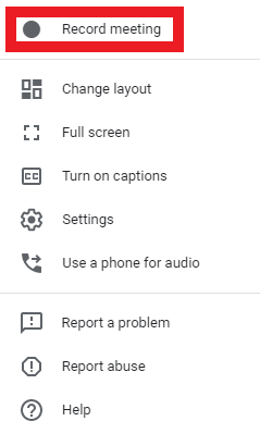 GSuite Enterprise, Enterprise Essentials, and Enterprise for Education customers (these are different editions of the GSuite product) always have access to a feature that allows the meeting organizer to record the meeting. For a limited time (until September 30th, 2020), all GSuite users have access to this feature. If you would like to utilize this feature after September 30th, you may need to upgrade your GSuite subscription. Contact your GSuite administrator (which may be TDO Support, if you receive your GSuite subscription through TDO Cloud Services) for more information.