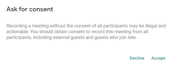 4. A message will display asking you to obtain consent from other meeting participants (i.e. the patient). Once you have obtained consent from the patient, click ’Accept’