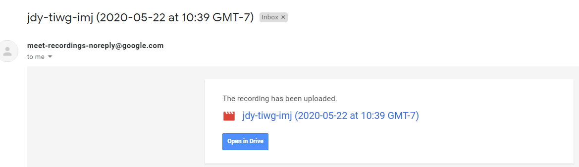 8. You (the meeting organizer) will receive an email with a link to open the meeting recording in Google Drive