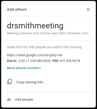 You may sometimes wish to start a Google Meet meeting without creating an appointment in TDO. For example, you may have to do an emergency consult with a patient, or you may want to meet with a referrer. In order to do so: