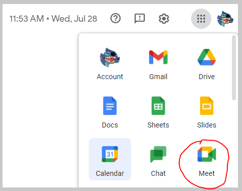 1. In your preferred browser (though Google Chrome is most optimized for this purpose), open meet.google.com. Check to make sure that you’re logged into the correct GSuite account by clicking in the upper right corner of the screen. If necessary, click ’Switch account’ to switch to the correct Google account.