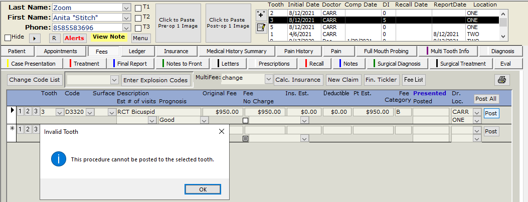 This message will pop up when an unassociated tooth is selected while posting fees.