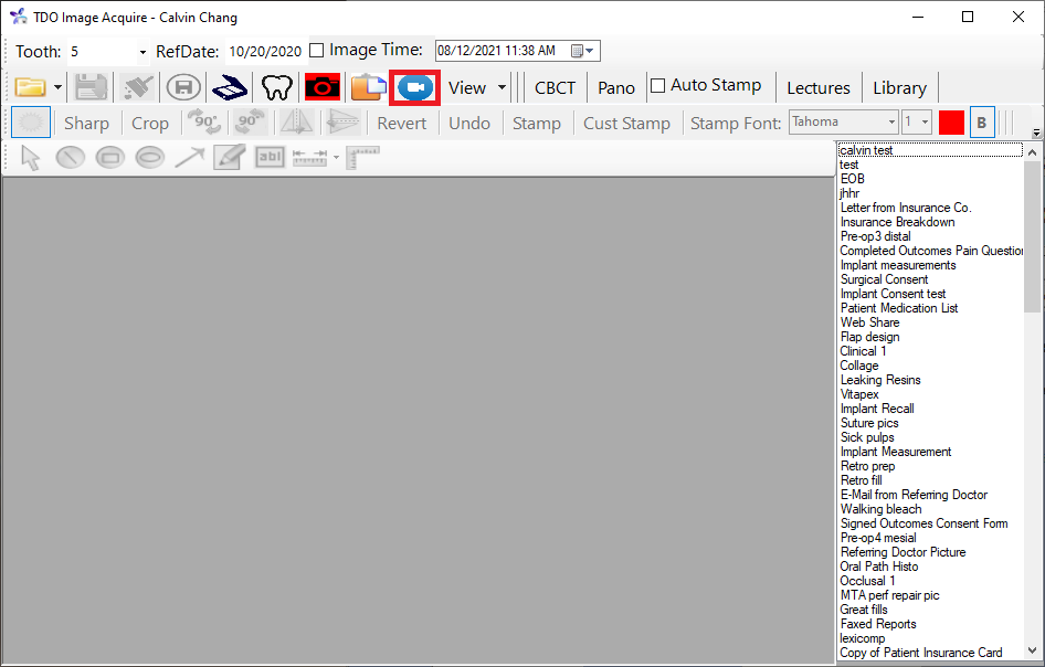 - Afterwards, the blank space below will be replaced with your video feed. From here, you can give your video a name using the Video Name box. The Take Picture box will take a picture of what's currently displayed on the screen and put it into the Image Acquire window for you to save to the patient's Image Organizer. The Record button will start recording your video. When you're ready to stop recording, you can use the Stop button to do so. Afterwards, when you're ready to save your video, you can use the Save button to save the video to the patient's Image Organizer.