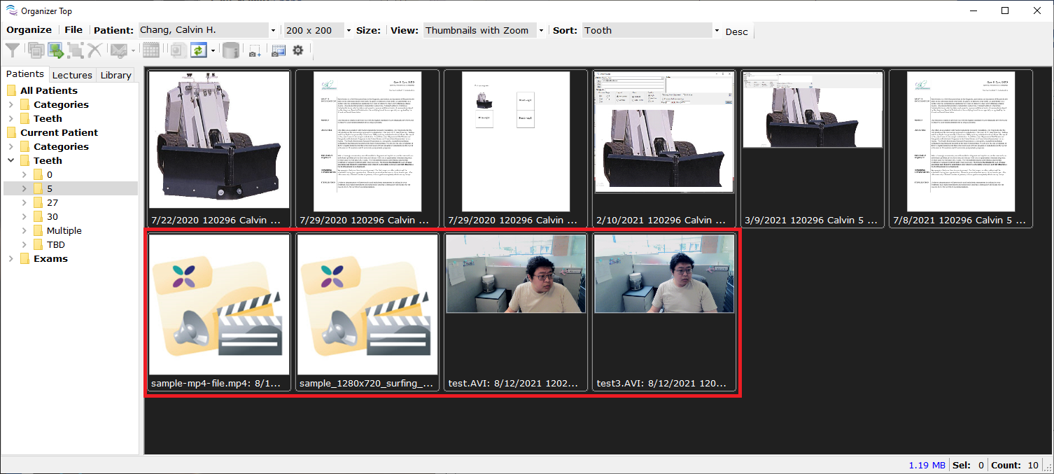 To import a video into a patient's chart, simply drag and drop the video file into the patient's Image Organizer. The video file does need to be one of the file types listed as supported above. Afterwards, you can categorize the video and assign it to a tooth as well as open from the Image Organizer.