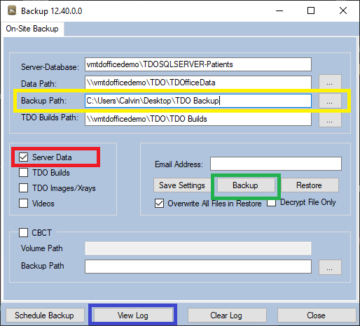 - Highlighted in Yellow: In the Backup Path window use the ellipses (...) to navigate to the newly created "TDO Backup" folder on the Desktop