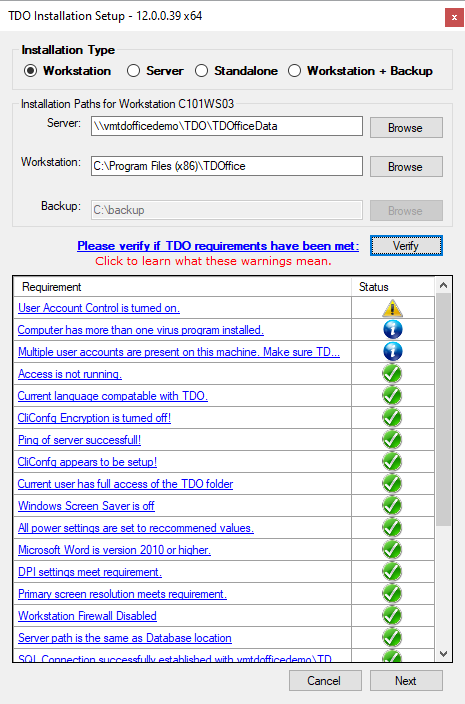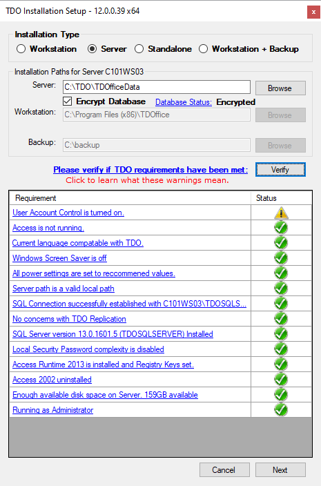 - Click Verify - this will prompt the installer to check and generate a list of requirements necessary for TDO to run