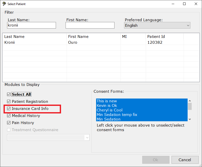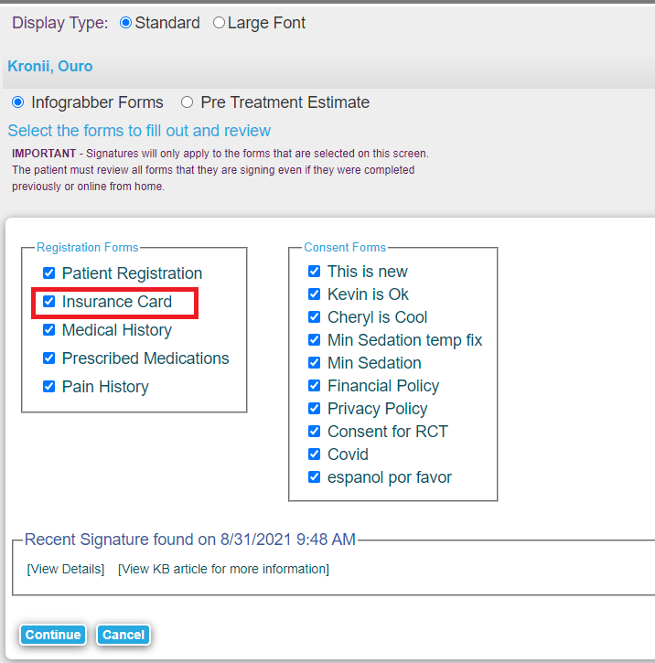 First, we need the patient to complete the Insurance Card from the Infograbber. When selecting which forms the patient will complete, make sure the Insurance Card box is checked. Otherwise, the patient will not be prompted to supply their insurance info. Shown below is where that option is for both the Infograbber program and the web Infograbber respectively.