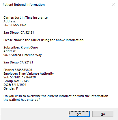 Note: This will only fill the subscriber information for the patient. You must select the insurance carrier based off the information in the Patient Entered Information window. If you select an existing Insurance Profile, it will overwrite the Employer and Group Number that the patient provided with the information you have on file.