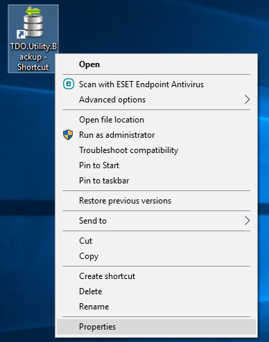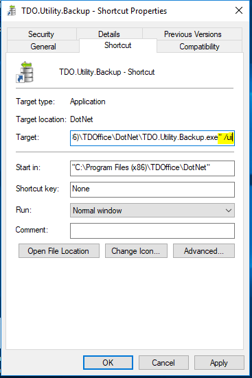 In the target field, following the path to TDO.Utility.Backup.exe, hit the spacebar and type /UI (make sure to include the space between .exe and /UI or it will not work).