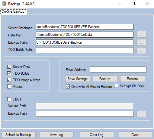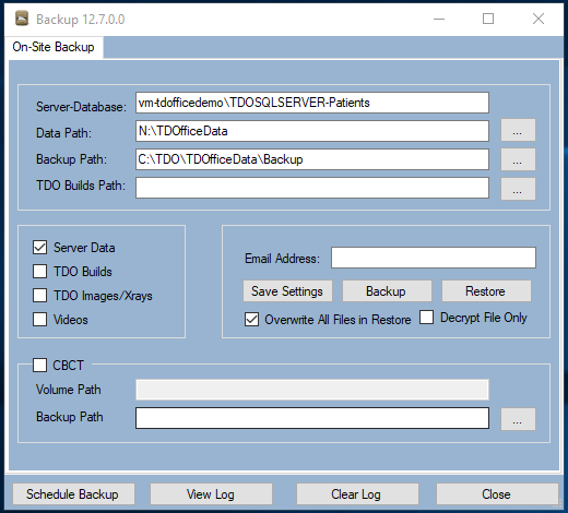 1) The Server-Database is the name of your SQL Server and your database. This is the SQL Server you are connected to. When you press the “Restore” button, your latest backup (in the “Backup Path”) will be copied into this server database. To restore more quickly, only check the box for “Server Data.” Restoring only the “Server Data” will take about 15 minutes. After the server data restore is complete, only check the box for “TDO Images/Xrays” and then click “Restore” again. Restoring the images will take longer than restoring the server data. This may take 30 minutes or more, depending on the size of your database; however, you may use TDO while the images are copied over.
