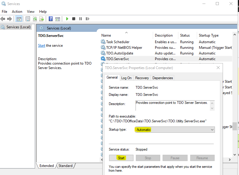 If you don’t see TDO.ServerSvc at all, you’ll need to install it by running TDOfficeData\TDO.ServerSvc\InstallServerSvc.bat as Administrator.