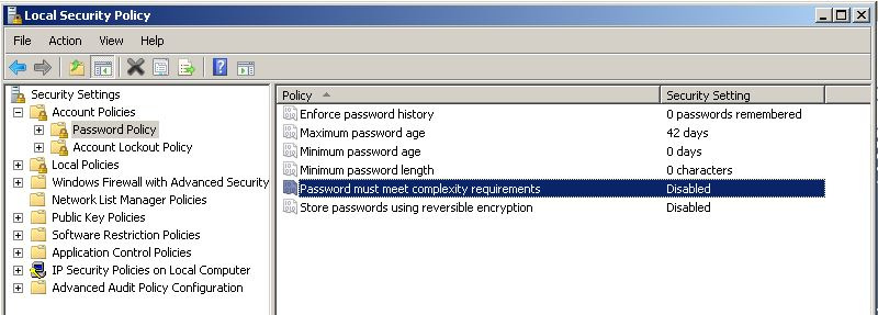 To disable the Password Complexity Policy, go to Administrative Tools in Windows and open the Local Security Policy application. Disable the Password Complexity Policy: