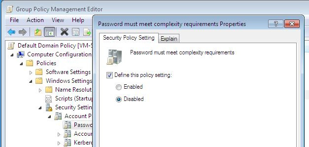 Double click “Password must meet complexity requirements” and change the value to Disabled and click OK: