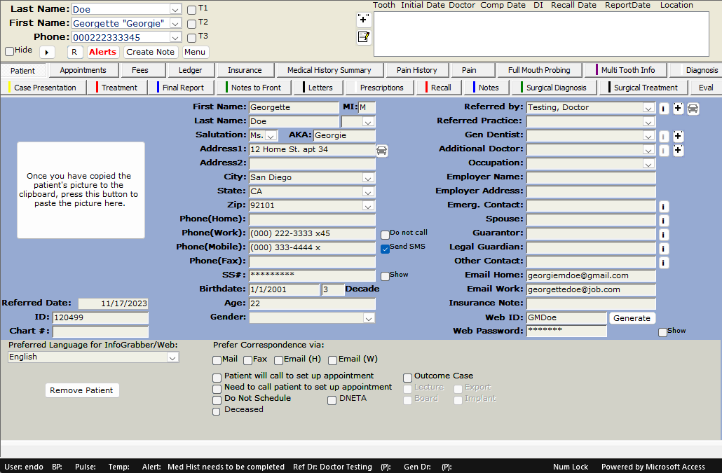 When logging into TDO the Patient page will always be the opening screen. Unless TDO has been newly installed on the computer, the Patient page will show the last patient that was viewed on the workstation. From here you can view all of your patient's general information including contact details, personal information, referral details, general dentist, employer, emergency contact, spouse, guarantor, legal guardian, email, and web credentials. As well as, mark a patient as do not schedule.