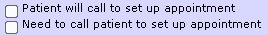 The checkboxes Patient will call to set up appointment and Need to call patient to set up appointment can be used to track unscheduled needed appointments. To see a list of patients corresponding to these checkboxes go to Reporting Tools > Administrative > Patients Needing and Appt > select the information you'd like to see, either Patients Needing an Appt - Need to Call or Patients Needing an Appt - Will Call Us.