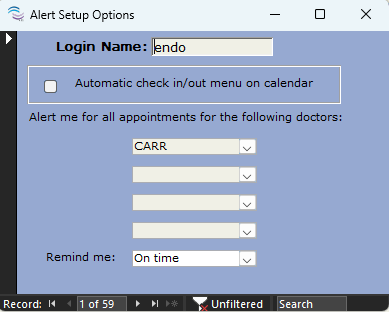 The Alert Setup Options is a user specific setting that will prompt a Calendar Reminder window to populate at the time of or in advance of appointments for the specified doctor(s). This function allows for a maximum of four (4) doctors to be selected at a time (minimum permitted selection is zero (0)) with eight (8) preset reminder time frame options to notify the user. The Calendar Reminder window can be made to repeat the alert by hitting Snooze. If the Calendar Reminder is closed without hitting Snooze the alert will not prompt again for that specific appointment.