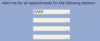 - Under the section labeled Alert me for all appointments for the following doctors, using the four drop downs, you can add zero (0) to four (4) doctors to have the selected user be notified about their upcoming appointments.