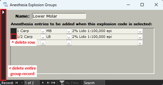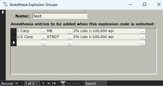 Explosion Groups allow your office to specify combinations of anesthesia. This is useful if you frequently give the same anesthesia for similar procedures. For example, a long buccal with a mandibular block would require 2 individual entries. This explosion group enters both injections with a single click.