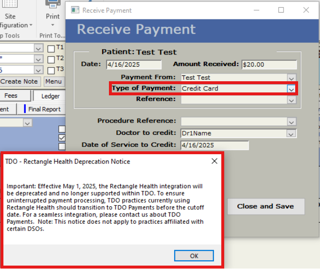 Starting on version 12.463 of TDO-12, a deprecation notice (Fig. A) regarding Rectangle Payment Processing will come up when “Credit Card” is selected as the type of payment when receiving a payment from the patients' ledger.